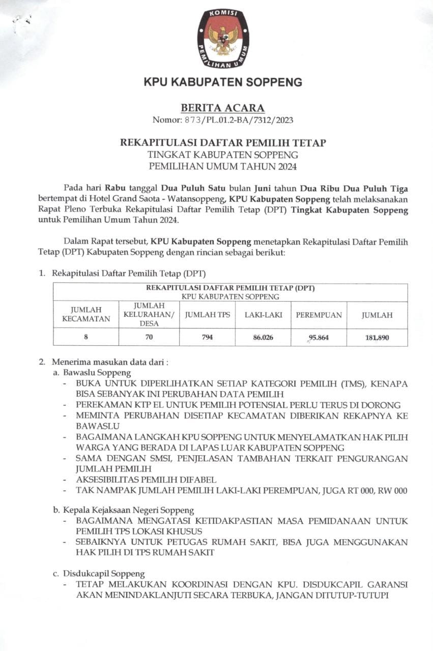 Berita Acara Rekapitulasi Daftar Pemilih Tetap (DPT) Kabupaten Soppeng pada Pemilu Serentak Tahun 2024 bisa didownload disini