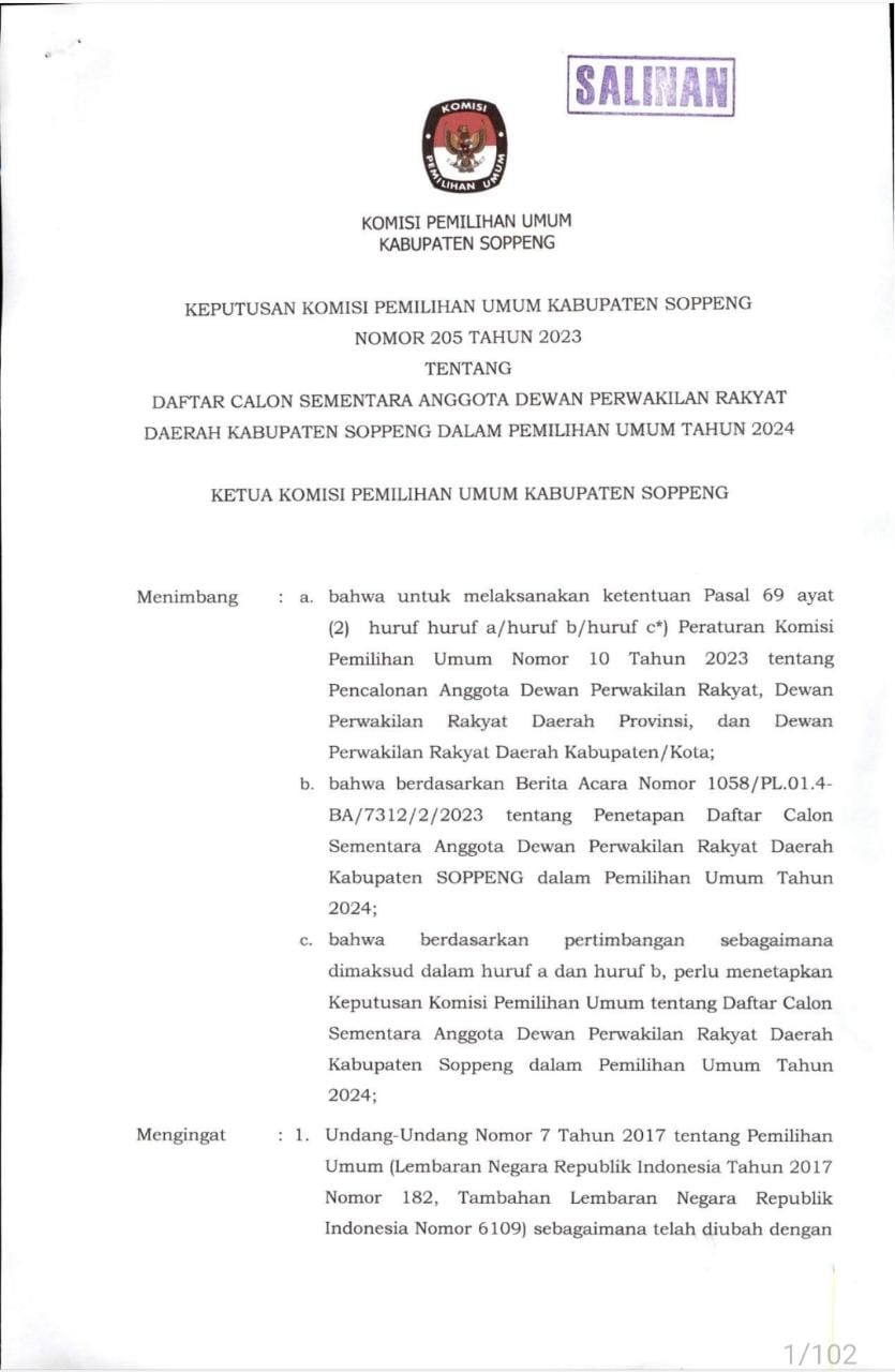 Daftar Calon Sementara Anggota DPRD Kab. Soppeng Pemilu 2024 Sabtu, 19 Agustus 2023 00:00 1496 Pengumuman Nomor 1059/PL.01.4-Pu/7312/2/2023 bisa diunduh disini SK No. 205 Tahun 2023 Tentang DCS Anggota DPRD Kab. Soppeng Pemilu 2024 bisa diunduh disini Bagikan: Dilihat 1,496 Kali.