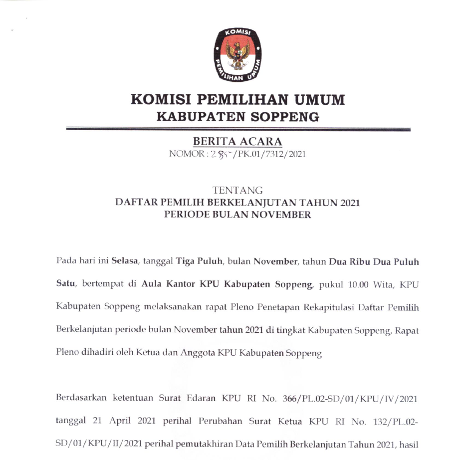 KPU kabupaten Soppeng melaksanakan rapat pleno pemutakhiran data pemilih berkelanjutan (PDPB) periode bulan November 2021, Selasa tanggal 30 November 2021 di aula kantor KPU Kabupaten Soppeng pukul 10.00 WITA, KPU Kabupaten Soppeng menetapkan PDPB untuk periode bulan November 2021 berjumlah 173.995 dengan rincian laki-laki 81.647 perempuan 92.348 tersebar di 8 kecamatan, potensi pemilih baru total 154 pemilih laki-laki berjumlah 89 perempuan 65 pemilih TMS total 269 laki-laki berjumlah 125 perempuan 144, perbaikan data pemilih total 107 laki-laki berjumlah 46 perempuan 61.