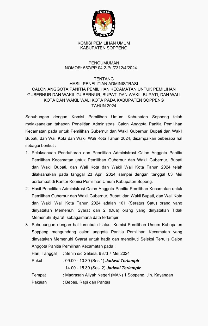 Sehubungan dengan Komisi Pemilihan Umum Kabupaten Soppeng telah melaksanakan tahapan Penelitian Administrasi Calon Anggota Panitia Pemilihan Kecamatan untuk Pemilihan Gubernur dan Wakil Gubernur, Bupati dan Wakil Bupati, dan Wali Kota dan Wakil Wali Kota Tahun 2024, disampaikan beberapa hal sebagai berikut :