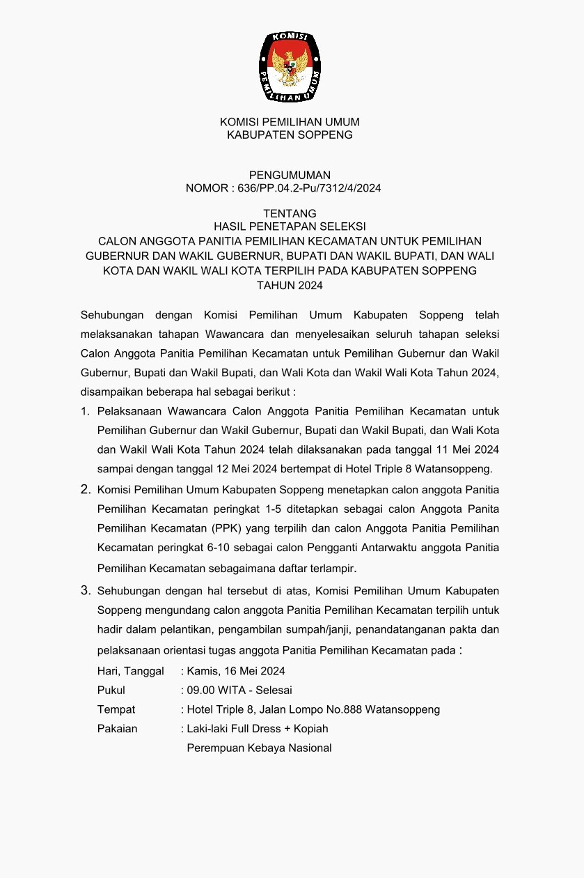 Sehubungan dengan Komisi Pemilihan Umum Kabupaten Soppeng telah melaksanakan tahapan Wawancara dan menyelesaikan seluruh tahapan seleksi Calon Anggota Panitia Pemilihan Kecamatan Untuk Pemilihan Gubernur dan Wakil Gubernur, Bupati dan Wakil Bupati, dan Walikota dan Wakil Walikota Tahun 2024 disampaikan beberapa hal sebagai berikut :