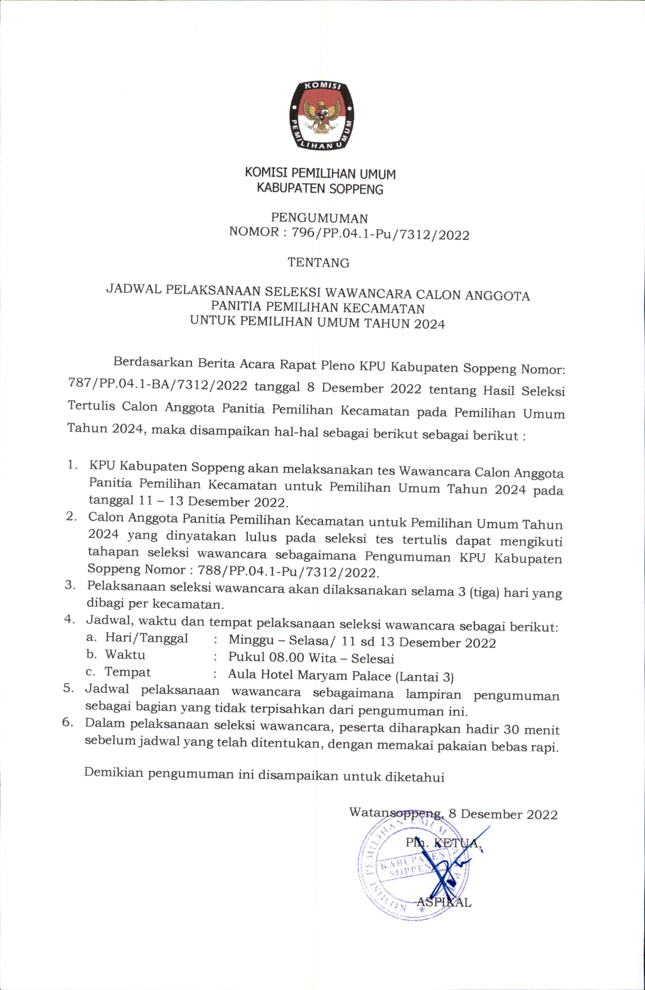 Jadwal Seleksi Wawancara Calon Anggota PPK Pemilu Tahun 2024 Kamis, 08 Desember 2022 17:00 570 Unduh Pengumuman Disini Bagikan: Dilihat 570 Kali.