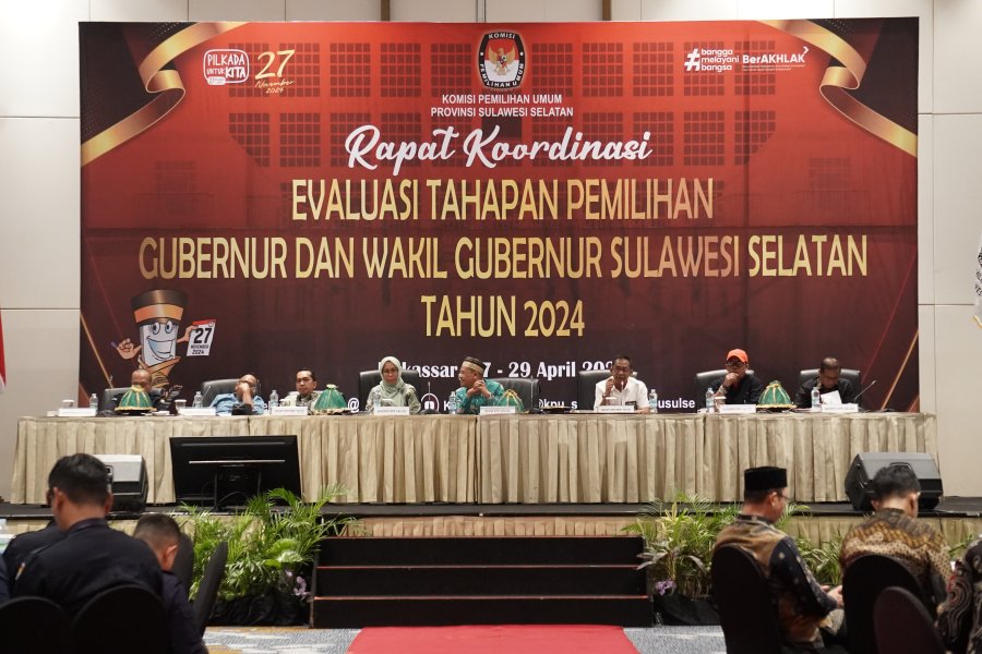 KPU Provinsi Sulawesi Selatan melaksanakan Rapat Koordinasi Evaluasi Tahapan Pemilihan Gubernur dan Wakil Gubernur Provinsi Sulawesi Selatan tahun 2024 pada tanggal 27 sd 29 April 2025 yang dilaksankan di Hotel Claro Makassar Jl. A. Pettarani. Kegiatan ini mengundang semua jajaran KPU Kabupaten/Kota di 24 KPU Kabupaten/Kota dan menghadirkan unsur Forkopinda Provinsi Sulawesi Selatan serta stake holder yang menjadi mitra KPU Provinsi Sulawesi Selatan dalam pelaksanaan Pemilihan Gubernur dan Wakil Gubernur Sulawesi Selatan. Kegiatan ini dihadiri langsung oleh Ketua KPU RI Bapak Mochammad Afifuddin bersama Anggota KPU Divisi Perencanaan, Keuangan, Umum, Rumah Tangga dan Logistik Bapak Yulianto Sudrajat.