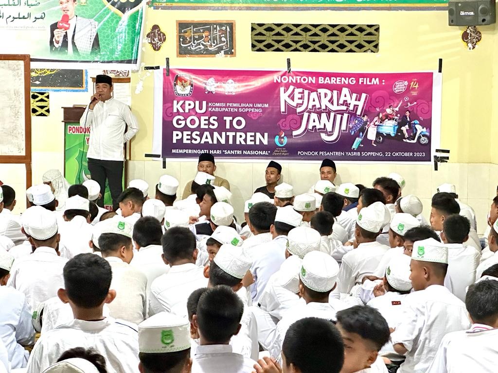 Ahad (22/10/2023), bertepatan dengan peringatan Hari Santri, KPU Kabupaten Soppeng mengunjungi Pondok Pesantren Yasrib Lapajung untuk menggelar acara Nonton Bareng (Nobar) Film Kejarlah Janji. Film berdurasi 120 menit dengan tema Kepemiluan ini ditonton bersama 100 (seratus) orang santri dan santriwati yang telah masuk dalam kategori pemilih karena telah berusia 17 Tahun saat hari pencoblosan 14 Februari 2024 mendatang.