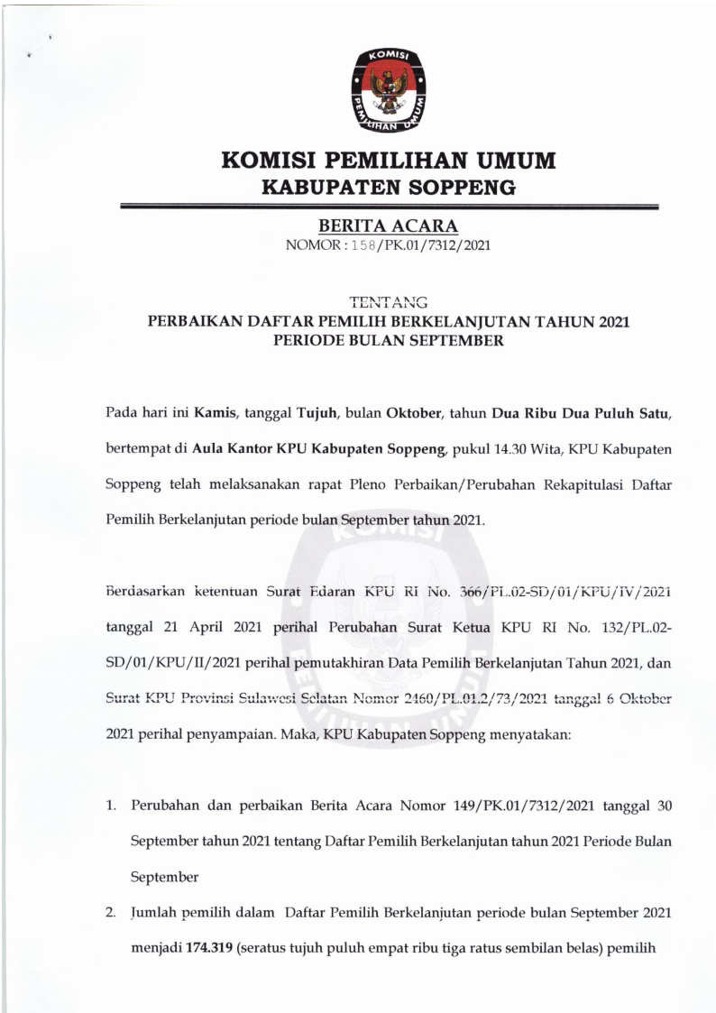 Watansoppeng, Kamis 07/10/2021, KPU Soppeng melaksanakan Rapat Pleno perbaikan Data Pemilih Berkelanjutan (DPB) periode September 2021 di Aula KPU Soppeng dipimpin oleh Ketua KPU Soppeng yang dihadiri oleh Anggota dan staff Sekretariat KPU Soppeng. Rapat Pleno menetapkan Jumlah DPB hasil perbaikan periode September berjumlah 174.319 Pemilih yang terdiri dari Laki-Laki 81.812 Pemilih dan Perempuan 92.507 Pemilih.