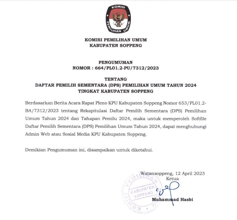 Pengumuman Daftar Pemilih Sementara (DPS) Pemilu 2024 Tingkat Kab. Soppeng Rabu, 12 April 2023 13:00 574 Berita Acara bisa dilihat disini Surat Keputusan bisa dilihat disini Bagikan: Dilihat 574 Kali.