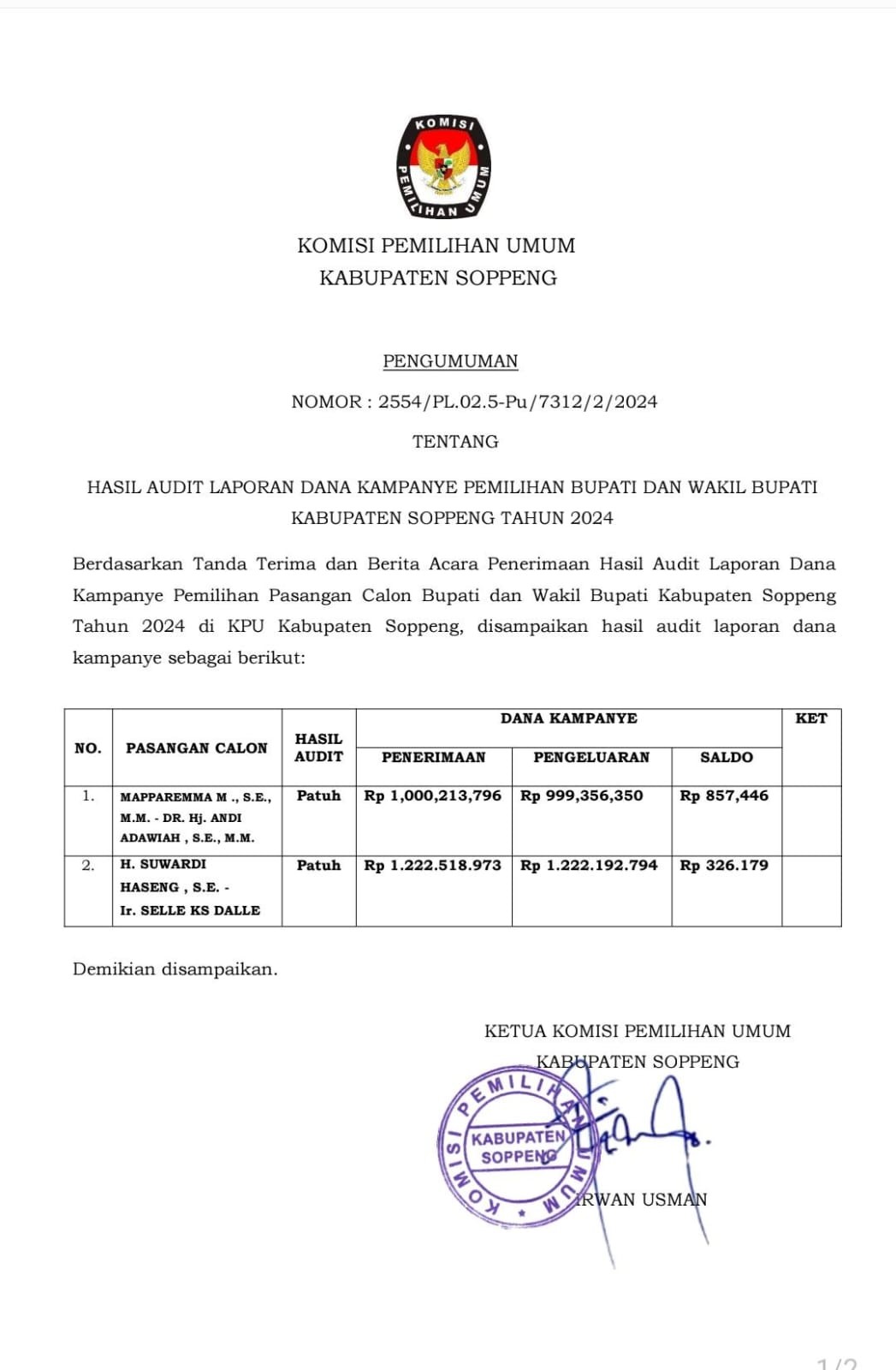 Pengumuman Hasil Audit Laporan Dana Kampanye Pilbup Soppeng Tahun 2024