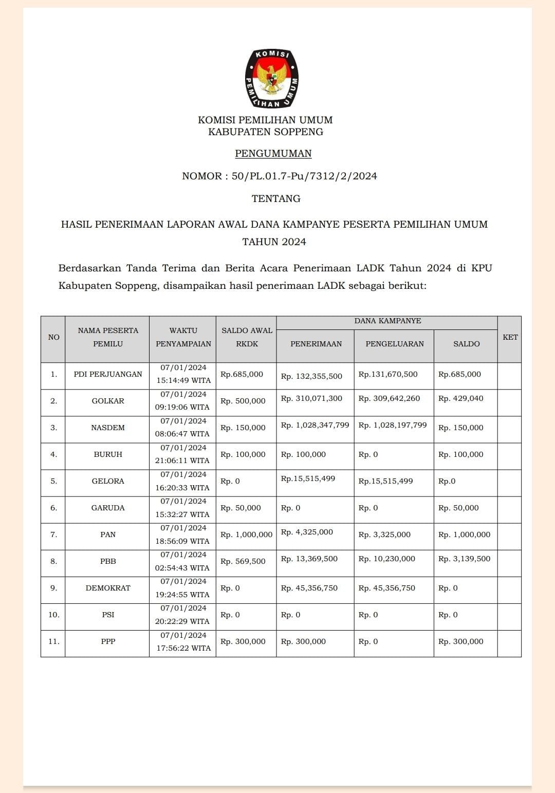 Berdasarkan Tanda Terima dan Berita Acara Penerimaan Laporan Awal Dana Kampanye (LADK) Tahun 2024 di KPU Kabupaten Soppeng, maka disampaikan hasil penerimaan LADK yang dilaksanakan pada hari Minggu, 07 Januari 2024. Adapun pengumuman ini dikhususkan bagi partai politik yang pada Tahapan Penyampaian LADK dinyatakan DITERIMA .