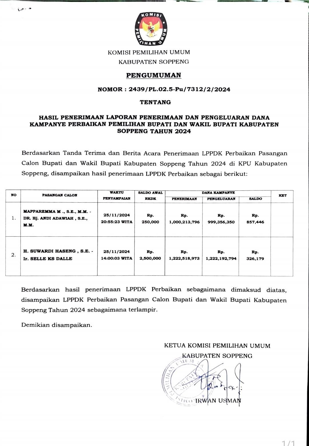 PENGUMUMAN HASIL PENERIMAAN LPPDK PERBAIKAN PILBUP SOPPENG TAHUN 2024
