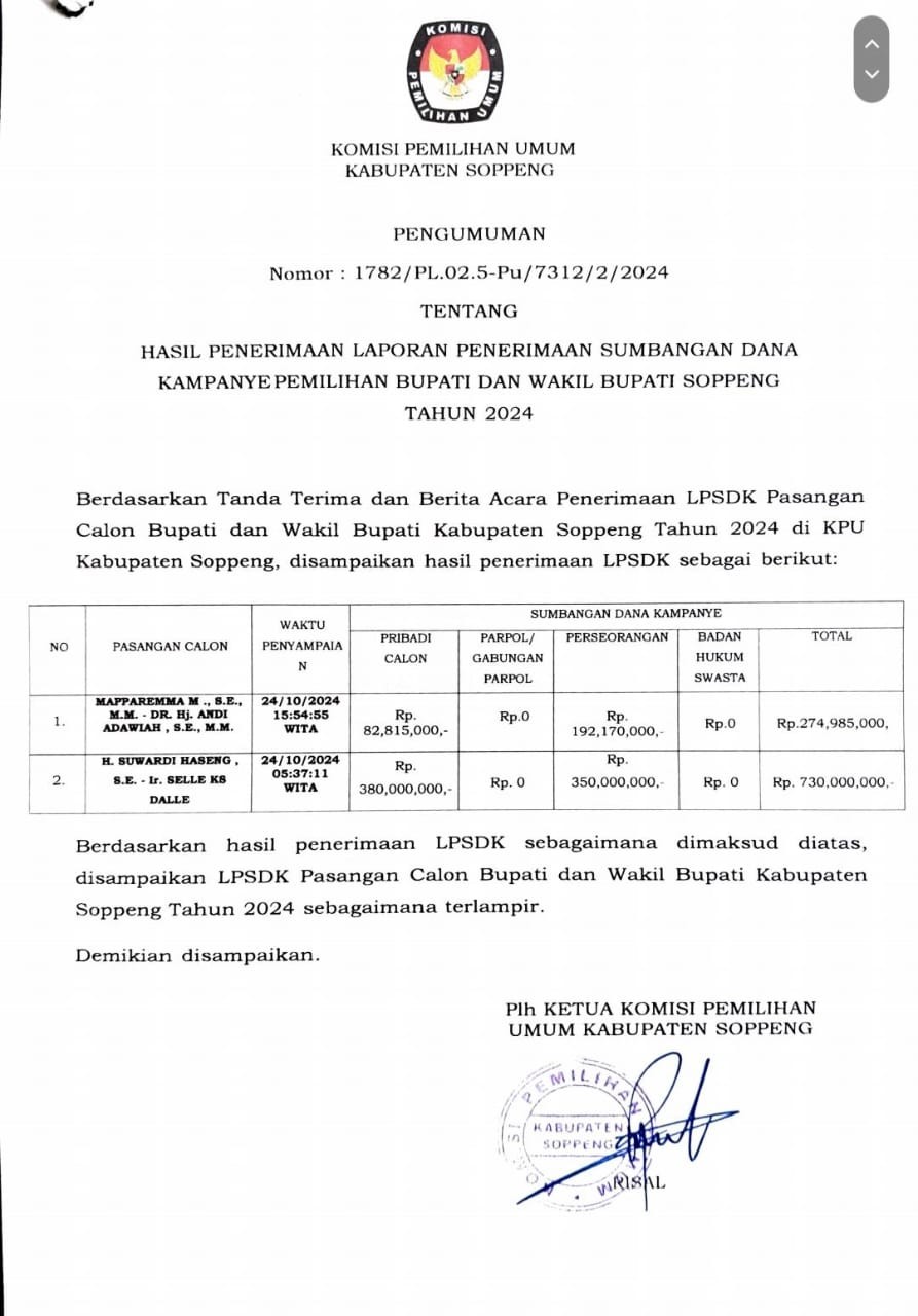 Berdasarkan Tanda Terima dan Berita Acara Penerimaan Laporan Penerimaan Sumbangan Dana Kampanye Pasangan Calon Bupati dan Wakil Bupati Kabupaten Soppeng Tahun 2024 tanggal 24 Oktober 2024, maka sesuai dengan PKPU Nomor 14 Tahun 2024 tentang Dana Kampanye Peserta Pemilihan Gubernur dan Wakil Gubernu, Bupati dan Wakil Bupati, serta Walikota dan Wakil Walikota pada Lampiran I Program dan Jadwal Kegiatan Tahapan Dana Kampanye bahwa Pengumuman LPSDK dilaksanakan pada tanggal 26 Oktober 2024.
