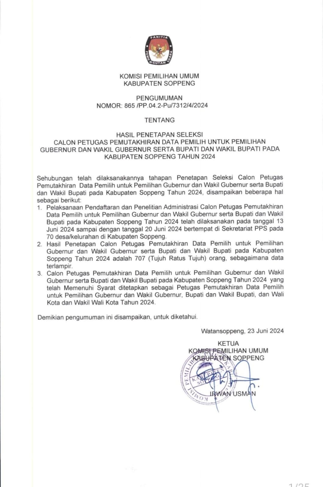 Pengumuman Hasil Penetapan Seleksi Calon Petugas Pantarlih Pemilihan Gubernur & Wakil Gubernur serta Bupati & Wakil Bupati Pada Kab. Soppeng Tahun 2024