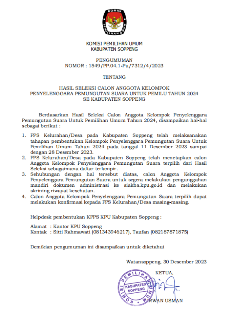 Pengumuman Hasil Seleksi KPPS Untuk Pemilu Tahun 2024