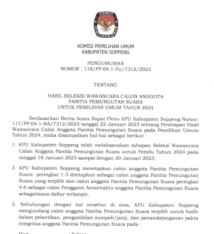 Pengumuman Hasil Seleksi Wawancara Calon Anggota PPS Pemilu 2024 Minggu, 22 Januari 2023 22:00 749 Pengumuman Download Disini Bagikan: Dilihat 749 Kali.