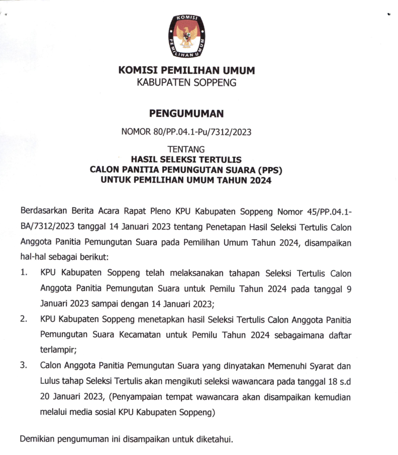Pengumuman Hasil Tes Tertulis Calon PPS Untuk Pemilihan Umum 2024 Minggu, 15 Januari 2023 07:00 663 Silahkan download pengumuman disini. Bagikan: Dilihat 663 Kali.