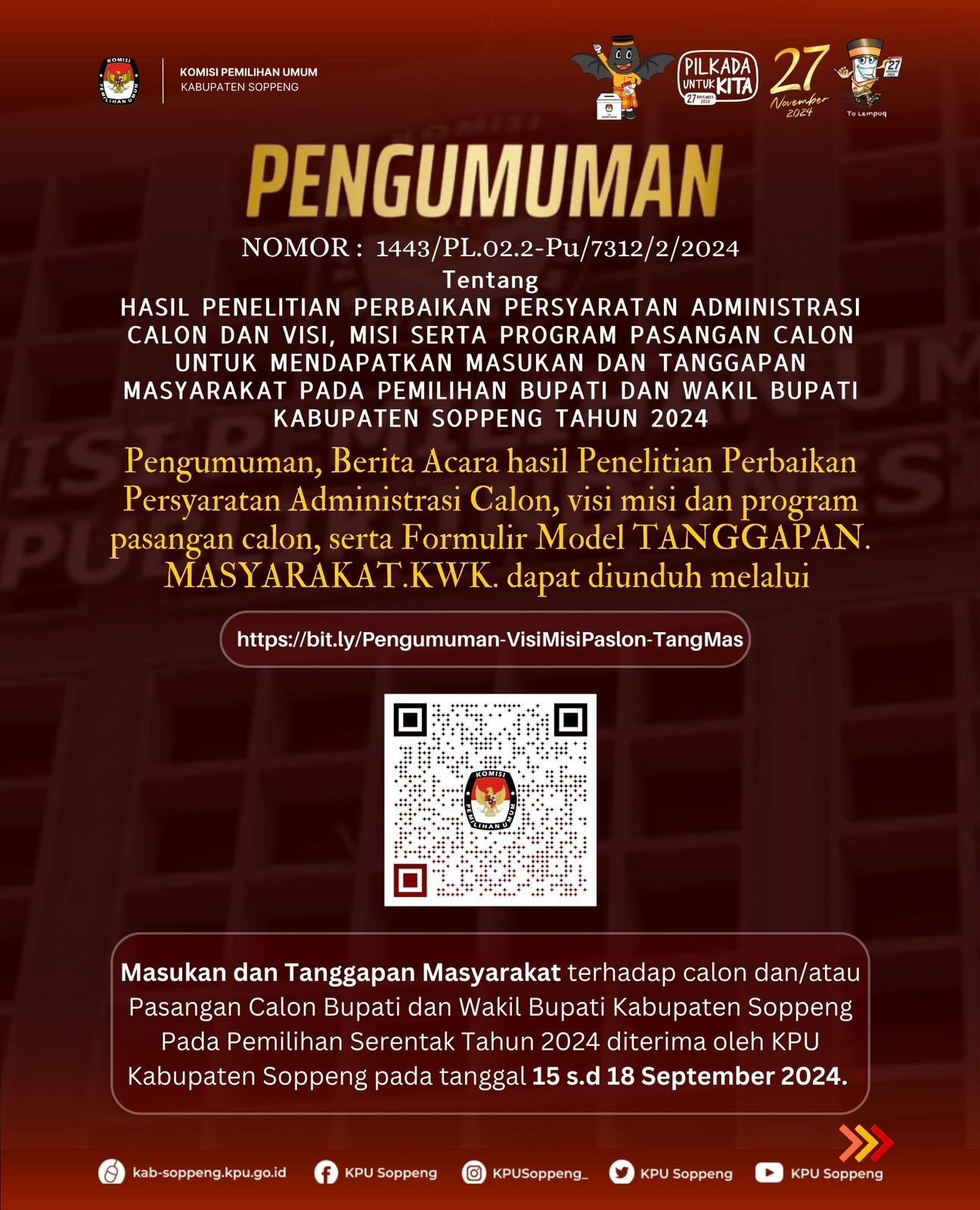 PENGUMUMAN HASIL VERMIN PERBAIKAN DAN VISI, MISI SERTA PROGRAM PASLON PADA PEMILIHAN BUPATI & WAKIL BUPATI KABUPATEN SOPPENG TAHUN 2024