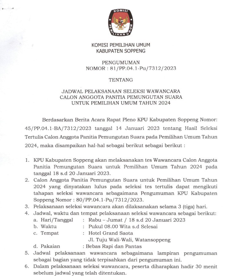 Pengumuman Jadwal Pelaksanaan Seleksi Wawancara Calon PPS Pemilu 2024 Senin, 16 Januari 2023 07:00 592 Silahkan Download Disini Bagikan: Dilihat 592 Kali.