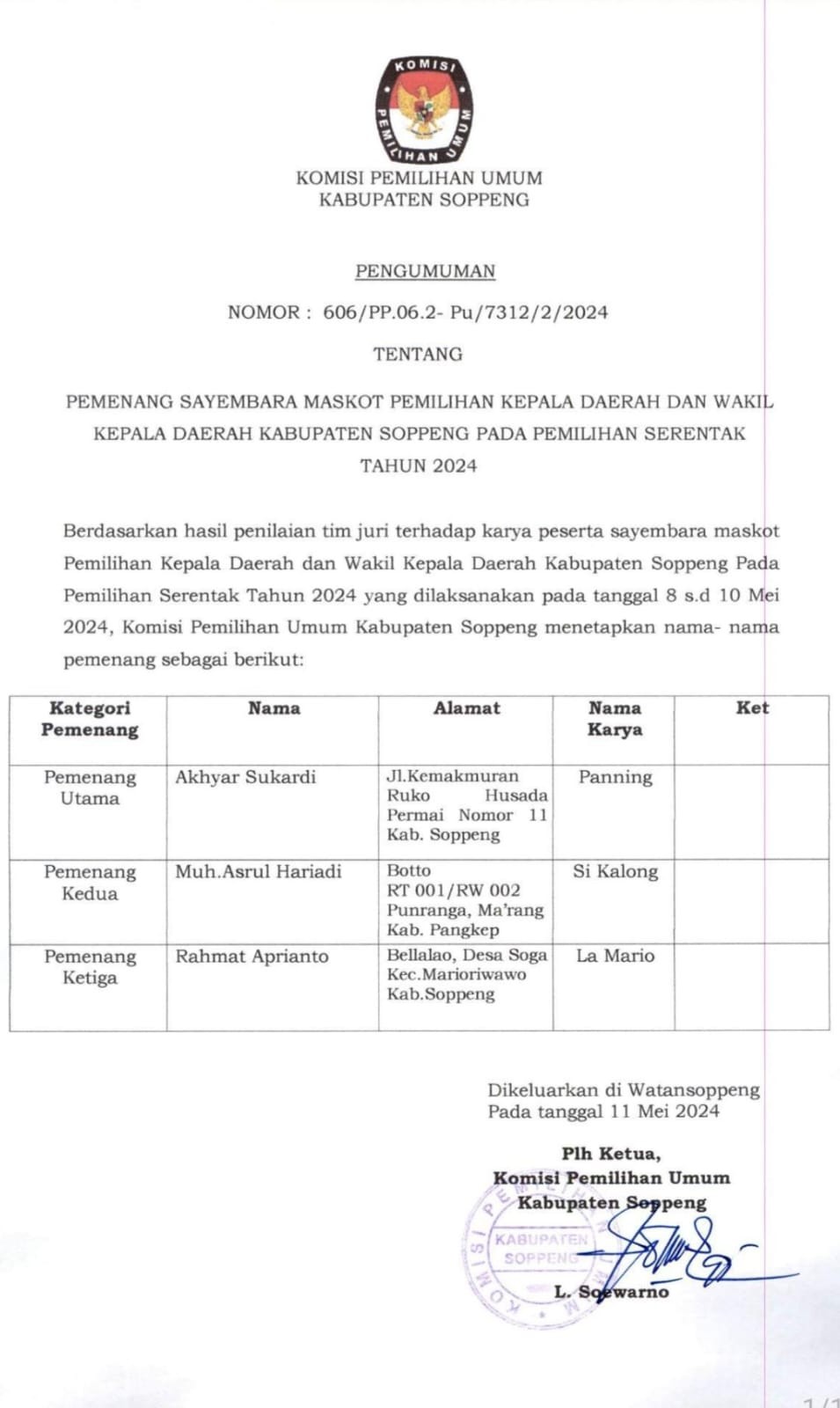 Berdasarkan hasil penilaian tim juri terhadap karya peserta sayembara maskot Pemilihan Kepala Daerah dan Wakil Kepala Daerah Kabupaten Soppeng pada Pemilihan Serentak Tahun 2024 yang dilaksanakan pada tanggal 08 s.d 10 Mei 2024, maka Komisi Pemioihan Umum Kabupaten Soppeng menetapkan nama- nama pemenang mulai Pemenang Utama, Pemenang Kedua dan Pemenang Ketiga.