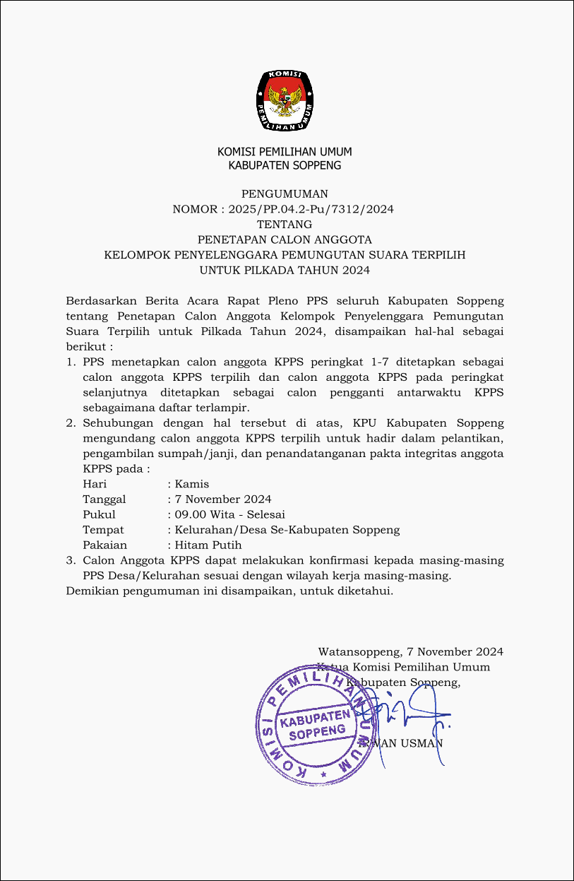 PENGUMUMAN PENETAPAN CALON ANGGOTA KELOMPOK PENYELENGGARA PEMUNGUTAN SUARA TERPILIH UNTUK PILKADA TAHUN 2024 Kamis, 07 November 2024 07:00 427 Download Pengumuman pada Link berikut : https://bit.ly/40H3opH Bagikan: Dilihat 427 Kali.