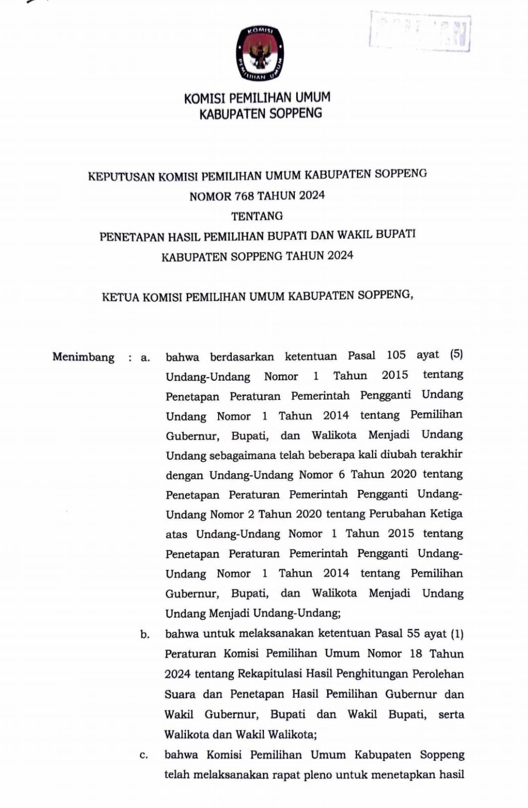 Adapun Salinan Surat Keputusan Nomor 768 Tahun 2024 tentang Penetapan Hasil Pemilihan Bupati dan Wakil Bupati Kabupaten Soppeng Tahun 2024 dapat diunduh melalui klik pada link unduh ini.