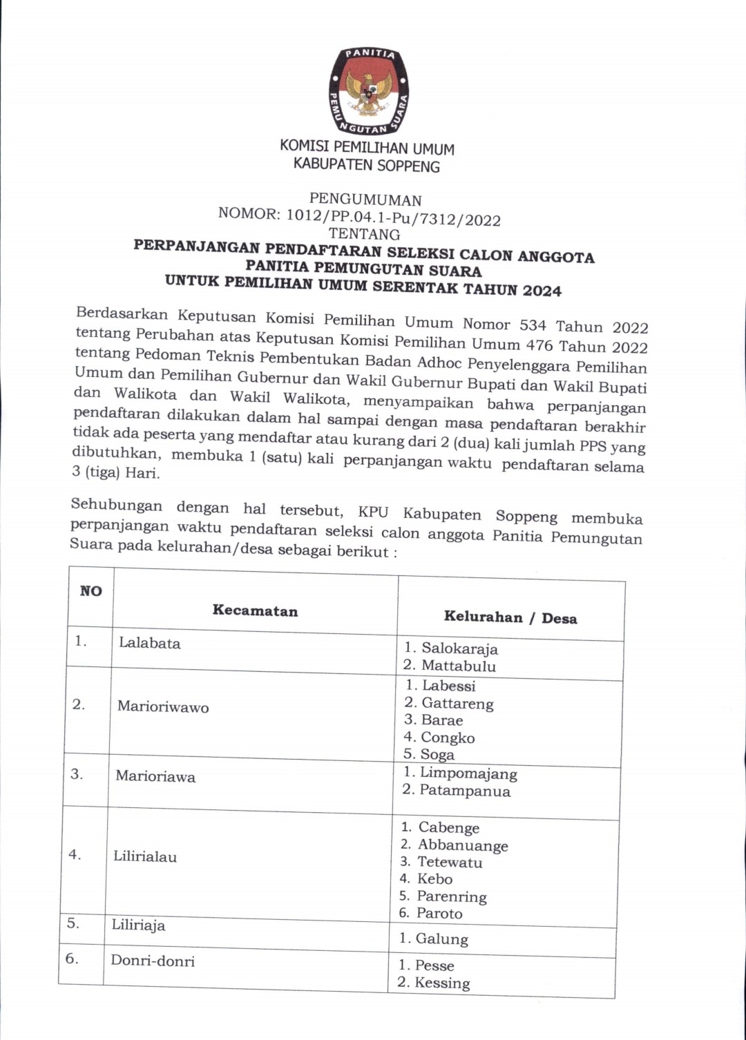 Pengumuman Perpanjangan Pendaftaran Seleksi Calon Anggota Panitia Pemungutan Suara (PPS) untuk Pemilu 2024 di 18 Desa/Kelurahan Sabtu, 31 Desember 2022 08:00 517 Silahkan download disini Bagikan: Dilihat 517 Kali.