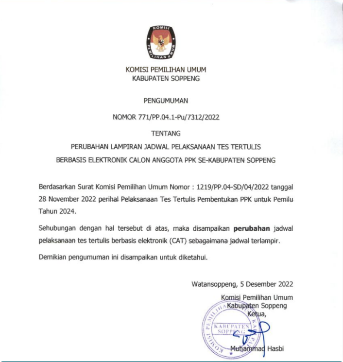 #TemanPemilih, berikut Pengumuman Perubahan Lampiran Jadwal Pelaksanaan Tes Tertulis Berbasis Elektronik Calon Anggota PPK Se Kabupaten Soppeng.