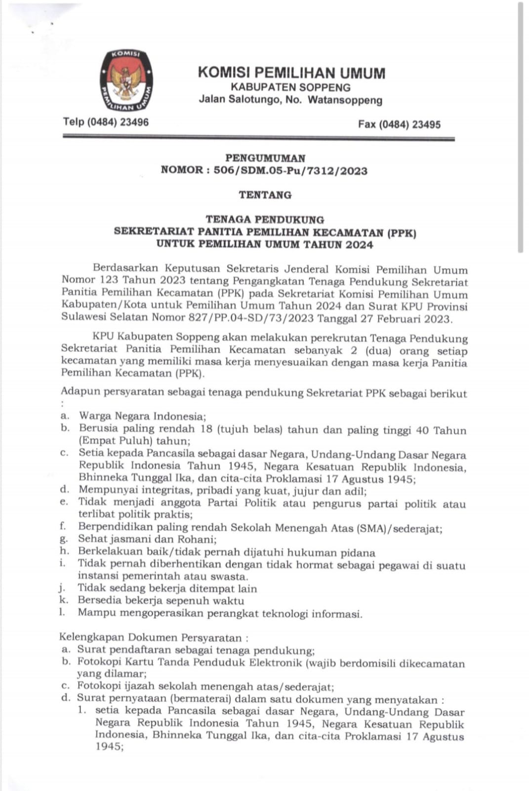 Pengumuman download disini https://kab-soppeng.kpu.go.id/public/kab-soppeng/dmdocument/1677677853Pengumuman Tenaga Pendukung Sekretariat PPK.pdf