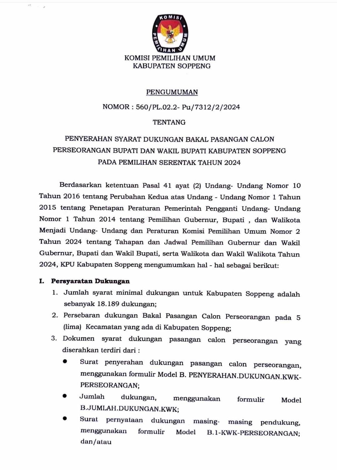 Maka, Komisi Pemilihan Umum Kabupaten Soppeng mengumumkan Penyerahan Syarat Dukungan Bakal Pasangan Calon Perseorangan Bupati dan Wakil Bupati Kabupaten Soppeng Pada Pemilihan Serentak Tahun 2024. Selengkapnya dapat dibaca dengan mengakses link dibawah ini :