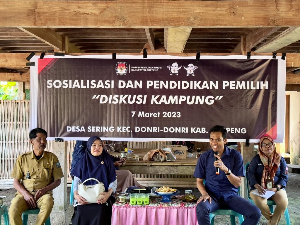 Setelah menempuh perjalanan kurang lebih 20 ( dua puluh) menit, tim sosialisasi dari KPU Kabupaten Soppeng tiba di Desa Sering Kecamatan Donri- Donri untuk melaksanakan kegiatan Sosialisasi dan Pendidikan Pemilih yang bertemakan Diskusi Kampung. Kegiatan ini bertempat di kediaman salah seorang kader Desa Peduli Pemilu dan Pemilihan (DP3) Harsimang yang juga merupakan salah seorang sekretariat Panitia Pemungutan Suara (PPS) di Desa Sering.