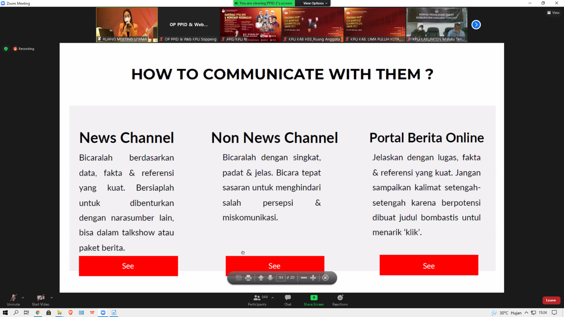 Materi Teknik Komunikasi dan penyampaian informasi ini adalah materi yang diikuti oleh peserta pada hari kamis (28/10/2021) sebagai hari kedua pelaksanaan rakornas dan workshop PPID dan kehumasan yang dilaksanakan oleh KPU RI di Sentul Bogor, Jawa Barat. Peserta hadir secara daring adalah Ketua dan Anggota KPU Divisi Sosialisasi, Pendidikan Pemilih & Partisipasi Masyarakat, Sekretaris, Kabag dan Kasubag Teknis & Hupmas, serta Operator E-PPID, website & media sosial dari 34 unit satker KPU Provinsi dan 514 unit satker KPU Kabupaten/Kota. Selain itu, peserta yang hadir secara luring sebanyak 70 orang.