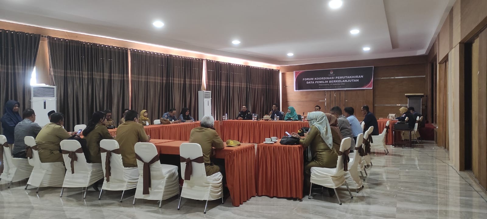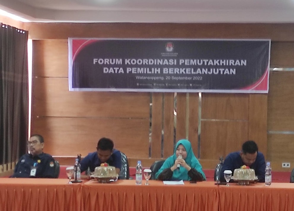 Selasa (20/09/2022), Komisi Pemilihan Umum Kabupaten Soppeng melaksanakan Forum Rapat Koordinasi Pemutakhiran Data Pemilih Berkelanjutan (PPDB) triwulan ketiga sebagai amanat dari Peraturan Komisi Pemilihan Umum Nomor 6 Tahun 2021 tentang Data Pemilih Berkelanjutan. Kegiatan ini terlaksana di hotel Grand Saota Watansoppeng dengan mengundang para pemangku kepentingan antara lain Bawaslu, Kapolres Soppeng, Dandim 1423 Soppeng, Camat se - Kabupaten Soppeng, Dinas Kependudukan & Pencatatan Sipil, Kemenag Kab. Soppeng, Kepala Rutan Kelas II B Kabupaten Soppeng, KesbangPol Kab. Soppeng, serta Ketua Musyawarah Kerja Kepala Sekolah (MKKS).