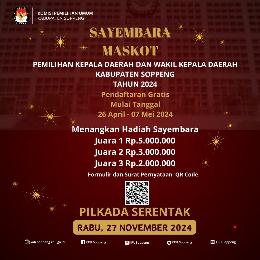 Komisi Pemiihan Umum Kabupaten Soppeng menyelenggarakan sayembara maskot dalam rangka Pemilihan Bupati dan Wakil Bupati Soppeng Tahun 2024. Untuk itu, bagi masyarakat umum yang berminat, silahkan ambil bagian dan turut meramaikan sayembara maskot ini, tentu saja dengan terlebih dahulu membaca syarat dan ketentuan yang berlaku.