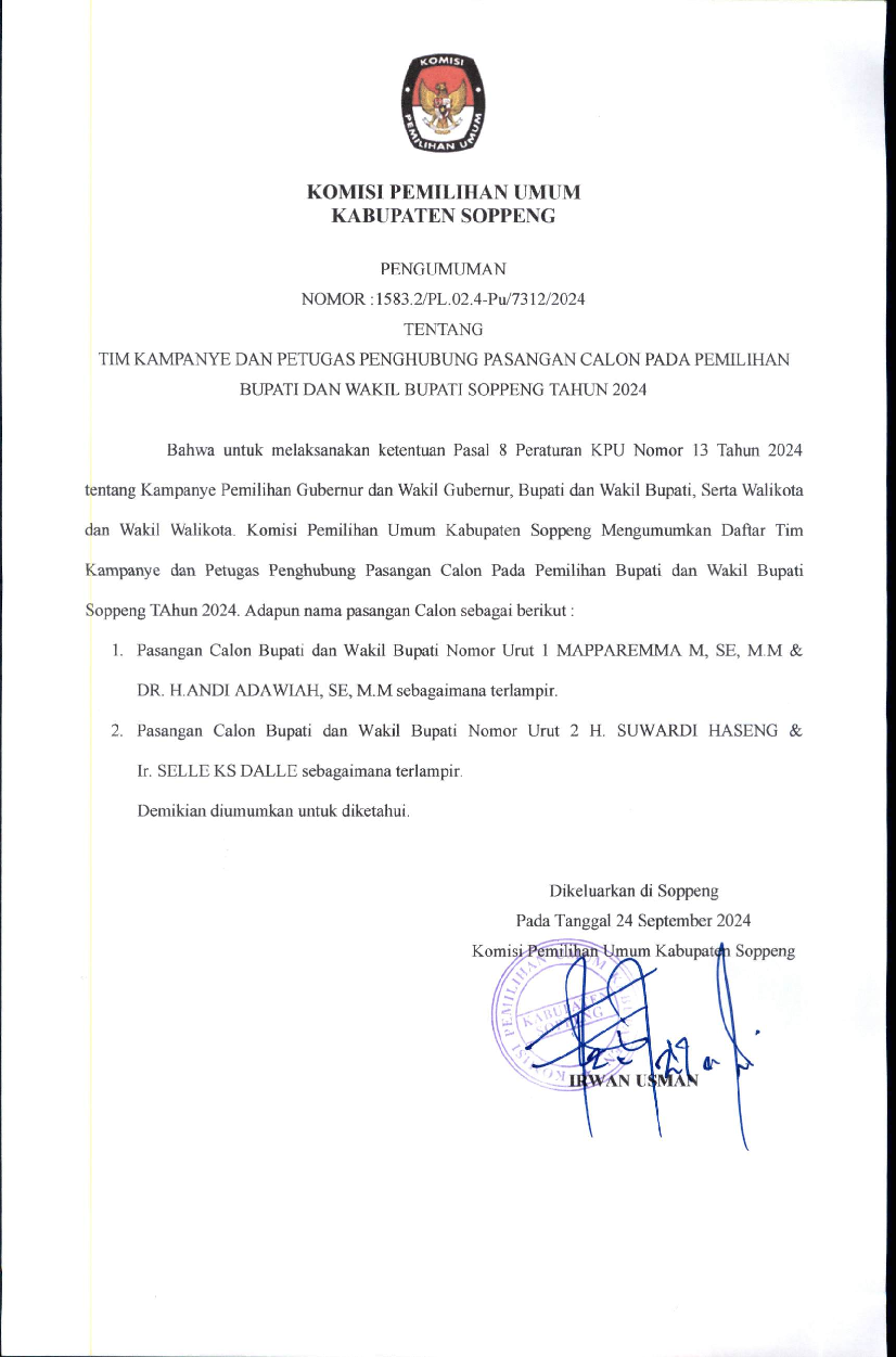 Bahwa untuk melaksanakan ketentuan Pasal 8 Peraturan Komisi Pemilihan Umum No 13 Tahun 2024 Tentang Kampanye Pemilihan Gubernur dan Wakil Gubernur, Bupati dan Wakil Bupati serta Walikota dan Wakil Walikota Tahun 2024 maka KPU KPU Kabupaten Soppeng mengumumkan Daftar Tim Kampanye dan Petugas Penghubung Pasangan Calon Bupati dan Wakil Bupati Soppeng. Adapun pengumuman dapat diakses melalui link https://bit.ly/TimKampanyePilkadaSoppeng2024.