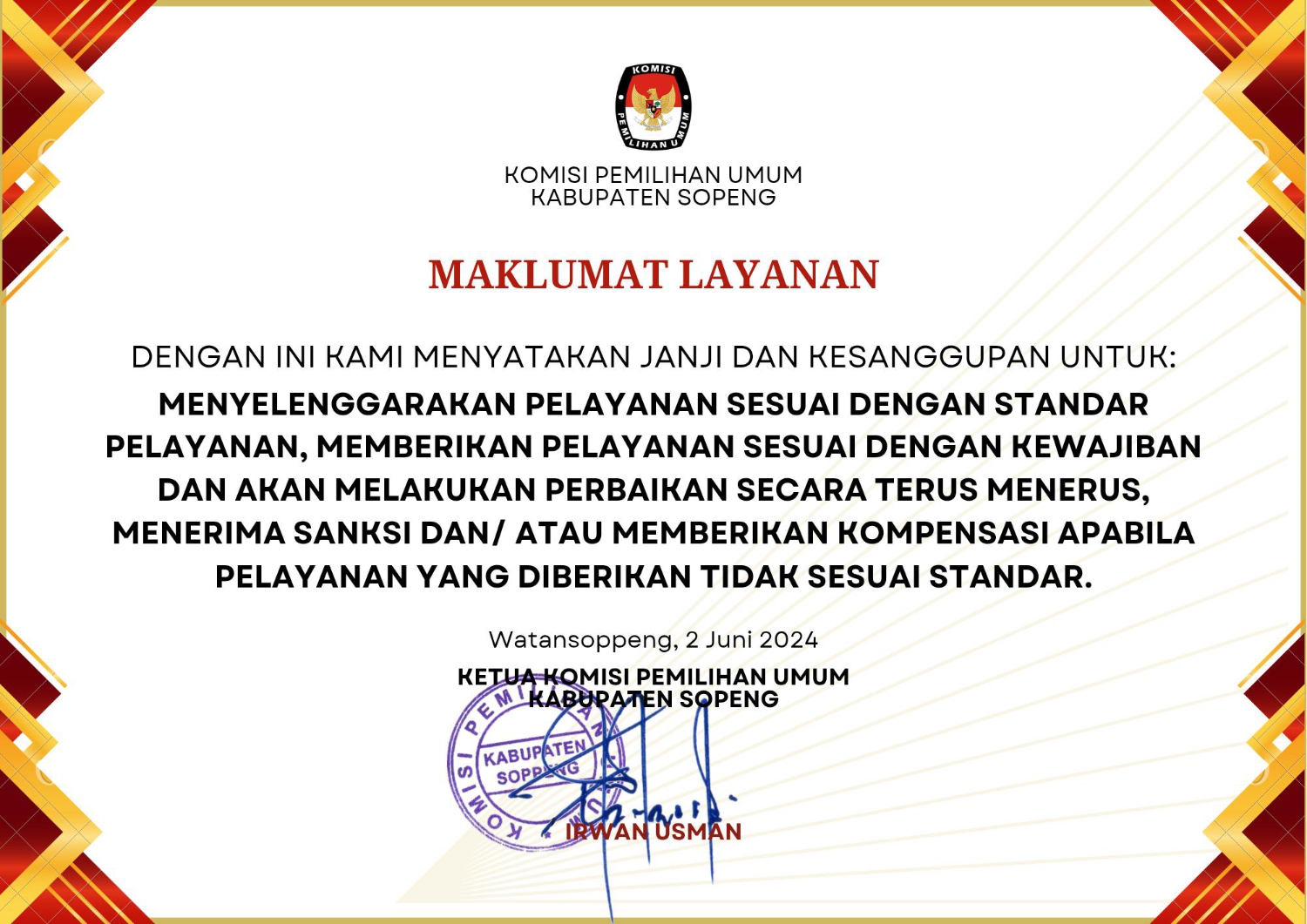 Maklumat pelayanan adalah pernyataan tertulis yang berisi keseluruhan rincian kewajiban dan janji yang terdapat dalam standar pelayanan. Sedangkan standar pelayanan adalah tolok ukur yang dipergunakan sebagai pedoman penyelenggaraan pelayanan dan acuan penilaian kualitas pelayanan sebagai kewajiban dan janji penyelenggara kepada masyarakat dalam rangka pelayanan yang berkualitas, cepat, mudah, terjangkau dan terukur.